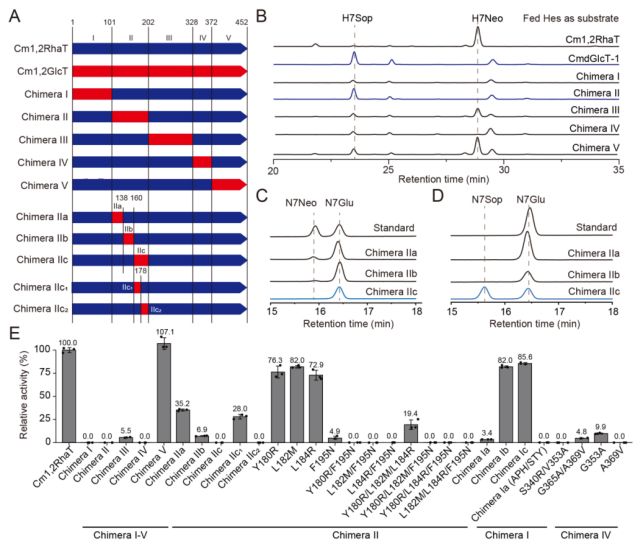 图2 决定Cm1,2RhaT糖供体特异性的关键氨基酸位点鉴定