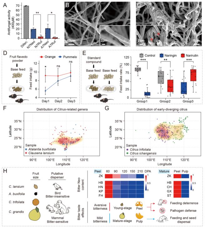 作为柑橘及其近缘属中含量最为丰富的两类类黄酮,芸香糖苷(Rut)广泛存在于近缘属中,而Neo则是早期分化柑橘特异性演化的产物。生物活性分析表明,相较于Rut,Neo表现出更强的抗真菌与抗哺乳动物取食活性。生物地理学分析发现,特异性积累Neo的早期分化柑橘(如枳、宜昌橙)相比不积累的近缘属(如黄皮、酒饼簕)拥有更广泛的地理分布,预示Neo在抵御生物胁迫与地理扩张中的潜在作用。同时,Neo在幼果和果皮中高积累、在成熟期果肉中大幅下降的时空分布模式,进一步印证了该类物质在“防御保护”与“种子传播”之间的动态平衡(图3)。