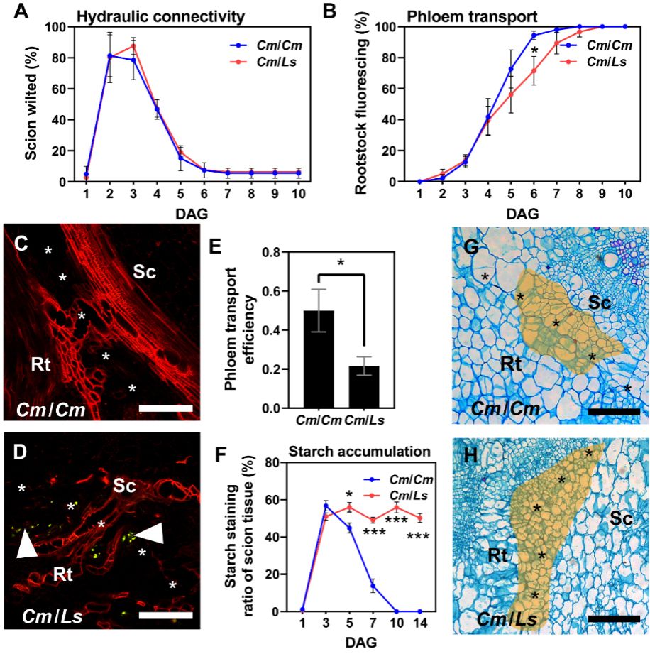 研究团队首先对多种甜瓜(Cucumis melo)接穗和葫芦(Lagenaria siceraria))砧木的嫁接亲和性进行了系统性的评价,发现甜瓜与葫芦存在普遍的嫁接低亲和性现象,即嫁接后植株虽能存活,但生长停滞。进一步的染料运输实验和组织切片观察表明,愈合部韧皮部的胼胝质沉积是导致甜瓜与葫芦低亲和性的直接原因。胼胝质的沉积阻碍了甜瓜接穗的光合产物向砧木的运输,限制了砧木根系成长;而有限的根系生长又无法为接穗提供足够的水分和营养物质支撑,最终导致“僵而不死”的典型低亲和性表型。值得注意的是,低亲和性葫芦砧木诱导甜瓜接穗在嫁接界面产生更多愈伤组织。