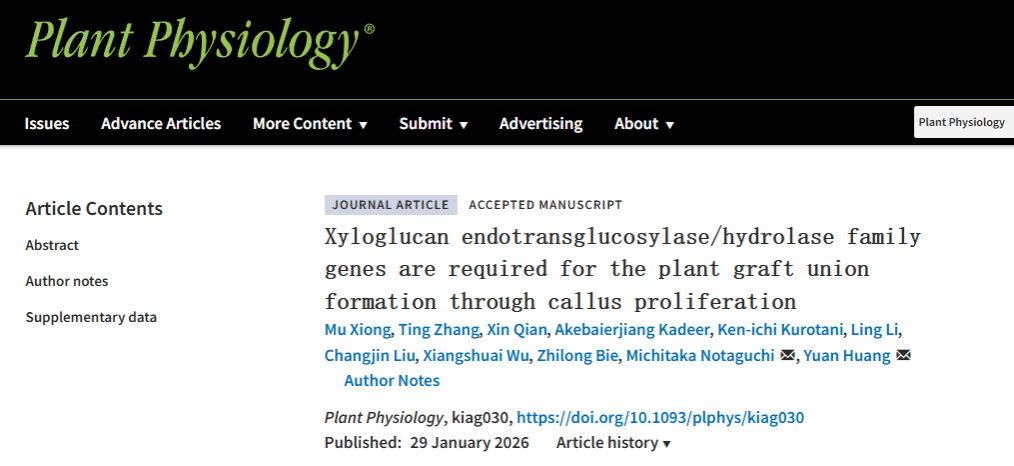 2026年1月29日,Plant Physiology在线发表了澳门十大网投正规官网平台、果蔬园艺作物种质创新与利用全国重点实验室黄远教授课题组与名古屋大学/京都大学Michitaka Notaguchi教授课题组合作完成的最新研究成果,论文题为“Xyloglucan endotransglucosylase/hydrolase family genes are required for the plant graft union formation through callus proliferation”。该研究揭示了木葡聚糖糖基转移/水解酶(XTH)家族基因通过调控愈伤组织的形成,来促进嫁接愈合的成功建立。