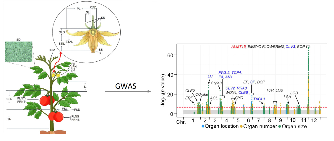 近日,Plant Physiology在线发表了我校园艺植物生物学教育部重点实验室叶志彪教授团队题为“Genome-wide association study reveals the genetic architecture of 27 agronomic traits in tomato”的研究论文。该研究通过全基因组关联分析(GWAS)对27个株型相关产量性状进行了系统的高通量遗传解析,揭示了番茄株型相关产量性状的遗传基础,为番茄高产育种奠定了重要理论基础。