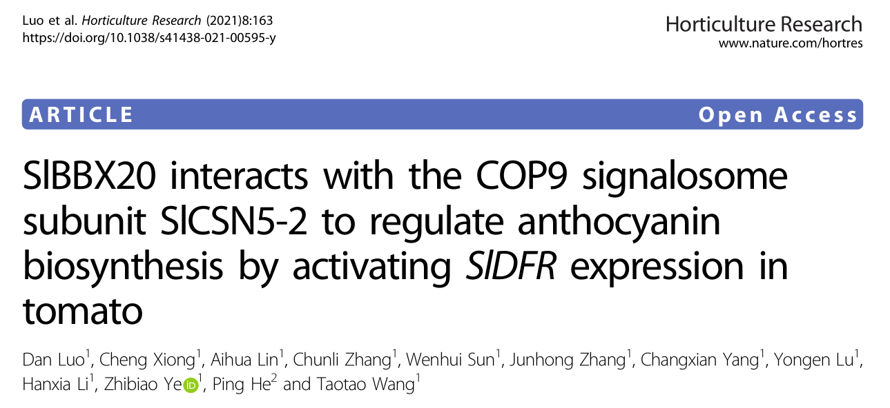近日,我校番茄团队发现超量表达SlBBX20 后花青素积累增多,提出了SlBBX20-SlCSN5-2互作调控番茄叶片花青素积累的模型,该研究揭示了光诱导花青素生物合成的一个新的调控途径。相关研究成果发表在国际学术期刊Horticulture Research上。