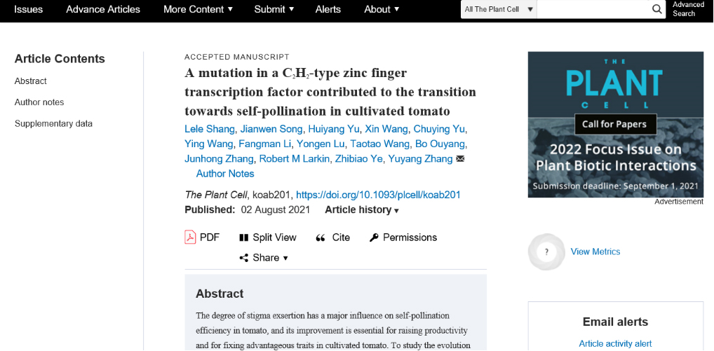 2021年8月2日,澳门十大网投正规官网平台叶志彪教授领衔的番茄团队在The Plant Cell发表了题为''A mutation in a C2H2-type zinc finger transcription factor contributed to the transition towards self-pollination in cultivated tomato''的研究论文,该文章鉴定了一个新的控制柱头延伸程度的基因,Stigma Exsertion 3.1(SE3.1),进一步揭示了番茄驯化和改良中自花授粉的转变过程。