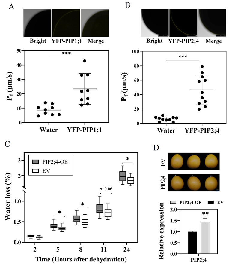 本研究发现,多数质膜内在水通道蛋白CsPIPs在柑橘果实采后失水过程中持续下调表达,其中CsPIP2;4在柑橘果皮表达丰度较高并且具有较好的水分转运活性。瞬时表达CsPIP2;4的金柑果实失水率在5小时后明显高于对照组金柑果实,表明CsPIP2;4的表达降低有助于延缓果实采后失水。