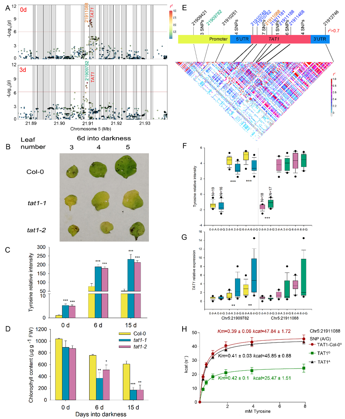 本研究检测了252份拟南芥自然群体材料经黑暗处理(模拟柑橘等园艺产品采后贮运条件)后初生代谢物及脂质含量,发现以糖及有机酸酸为代表的可以直接参与TCA循环供能的代谢物在黑暗处理后迅速下降,其可能作为黑暗诱导衰老早期响应物行使功能。支链氨基酸、色氨酸、酪氨酸等在黑暗处理前期因蛋白质的降解而逐步积累,而在黑暗处理后期通过降解途径为TCA循环提供底物,并直接为线粒体电子传递链提供电子等含量逐步下降。这些代谢物则作为黑暗诱导衰老的后期响应代谢物。此外,本研究基于3个时间点及各时间点的代谢物差异所开展的动态mGWAS鉴定到了参与营养物质再循环途径中代谢物降解、代谢物转运及行使转录调控效应等关联基因。深入的遗传调控机制解析发现TAT1对酪氨酸含量在正常和黑暗处理后存在不同遗传调控机制:在正常情况下,TAT1编码区能改变其蛋白序列的5个SNP差异导致了TAT1蛋白酶活的差异,从而影响不同材料酪氨酸的含量差异;在黑暗情况下,启动子区域5个SNP的差异影响了TAT1的表达量而进一步影响酪氨酸在群体中的含量差异。此外,参与苏氨酸代谢的THA1及甘氨酸转运的AVT1B也因启动子区域的SNP差异引起的表达差异而影响了相关代谢物在群体内的差异分布。本研究运用多时间点的动态mGWAS方法全面解析了拟南芥黑暗所诱导的衰老下初生代谢物及脂质再循环的遗传调控机制,鉴定的营养再循环相关基因为改良果实的物质循环及特定代谢物含量,维持果实采后品质提供了重要的理论参考。
