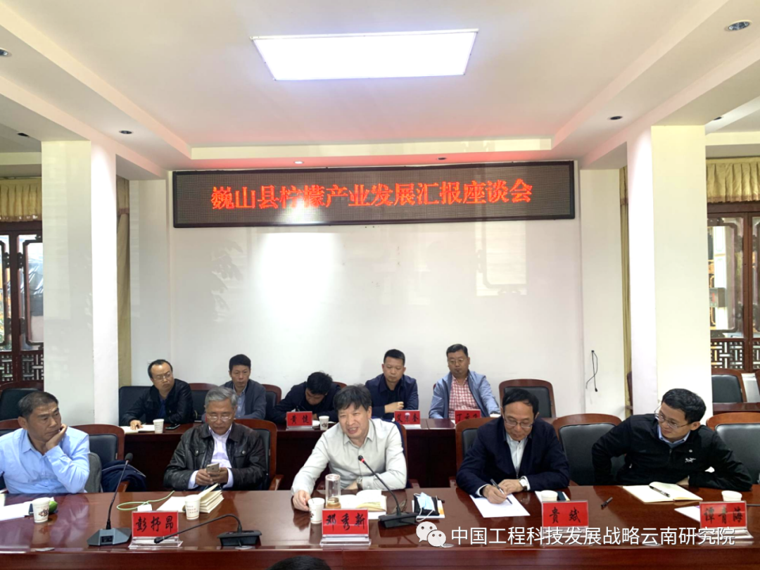 恳谈会上,巍山县委书记丁洪涛向调研组汇报了巍山县柠檬产业发展情况,并向调研组提出了希望帮助解决的困难和问题。调研组岳建强研究员、彭抒昂教授、高俊燕研究员、周先燕博士等专家分别对巍山县柠檬产业发展提出了意见建议。邓秀新院士指出,云南高原特色农业发展包括巍山柠檬产业发展一定要紧扣“错季、优质、特色”六个字,巍山柠檬产业发展必须把牢苗木质量和病虫害防治关口,适度规模、有序发展,做好产业发展规划,加强人才培训和配置。巍山县可以通过“揭榜制”“赛马制”等方式邀请相关科研机构和专家团队为巍山柠檬产业发展提供科技支撑服务。巍山县自2019年启动柠檬产业发展,已经在黑惠江沿江五个乡镇种植柠檬20000余亩,计划种植50000亩,将柠檬产业打造为亿级产业,产业发展从种苗繁育—基地种植—精深加工—冷链物流等全产业链已初具雏形。柠檬产业已经成为巍山县巩固脱贫攻坚成果与接续推进乡村振兴实施有效衔接的希望产业。