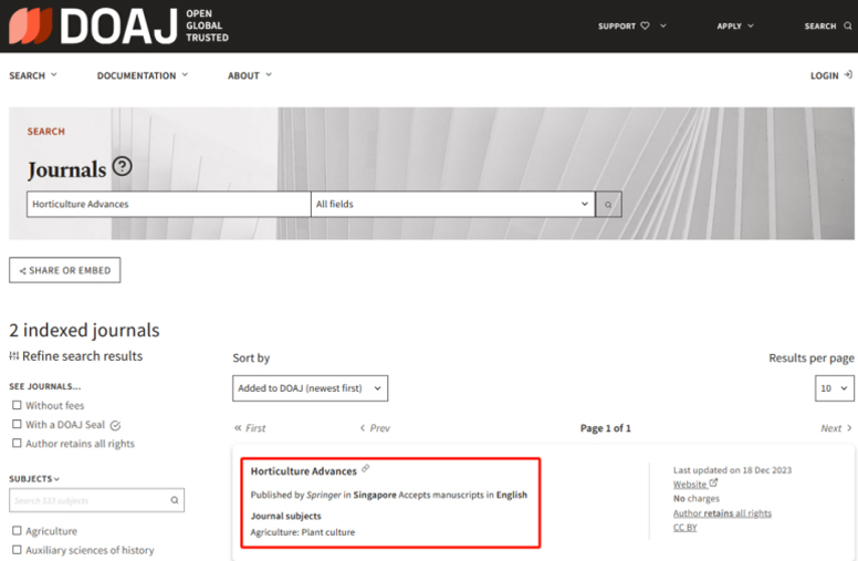 我校主办的期刊Horticulture Advances(《园艺进展》)于2023年12月18日正式被DOAJ(Directory of Open Access Journals)数据库收录。Horticulture Advances于今年6月创刊,仅半年就迎来突破性发展。这标志着Horticulture Advances期刊的质量控制及学术价值已达国际标准,得到了出版界及学术界的初步认可,国际影响力及知名度大幅提高。