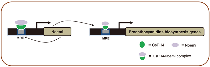 柑橘是世界第一大水果,其丰富的种质资源为果实品质形成调控机制研究及品质改良奠定了材料基础。本研究通过对原花青素差异积累的‘暗柳’、‘红暗柳’和‘埃及糖橙’甜橙的种子及幼果进行转录组测序,发现转录因子CsPH4和Noemi与柑橘原花青素的积累高度相关。在柑橘愈伤组织和拟南芥中超表达CsPH4和Noemi,两个转录因子均能诱导原花青素途径基因上调表达,从而促进原花青素的积累。有趣的是,在超表达CsPH4的柑橘愈伤组织中,还观察到Noemi被显著诱导表达。随后的生化实验进一步证实了CsPH4和Noemi能够相互作用形成复合体,直接结合到原花青素途径基因启动子的MRE元件从而激活其表达,同时该复合体也可与Noemi启动子直接结合,诱导Noemi上调表达,进一步促进原花青素的积累。该项研究成果丰富了人们对植物原花青素积累及转录调控机理的认识,完善了柑橘原花青素积累的调控机理,为柑橘果实品质改良奠定了理论基础。