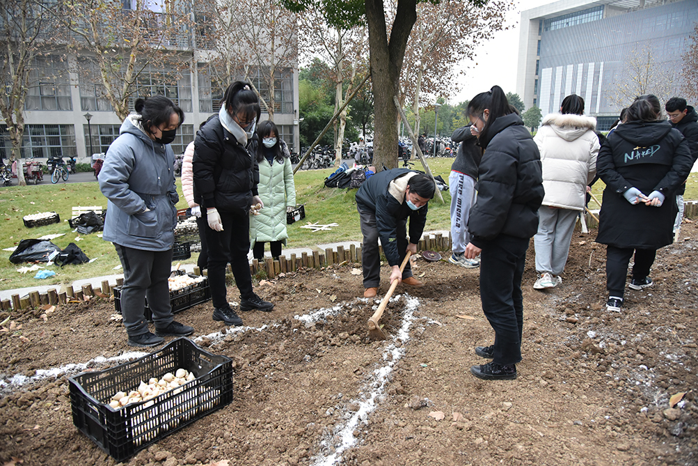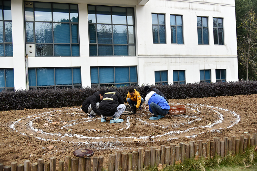 12月15日下午,由澳门十大网投正规官网平台实验室办公室策划组织的活动——“播种春天的郁金香” 于园林南楼门口开展。园林2001班师生在郁金香团队研究生的指导下,完成10000多颗郁金香种球的褐色外皮去除处理和部分种球的种植任务。郁金香种球种植后覆盖5-10cm左右土层,为保证景观效果需要密植,株行距为12-15cm左右。为了配合图案造型,种植过程需要耐心和细心,种植人员互相协调,严谨配合,以保证郁金香花圃造型的完美呈现。