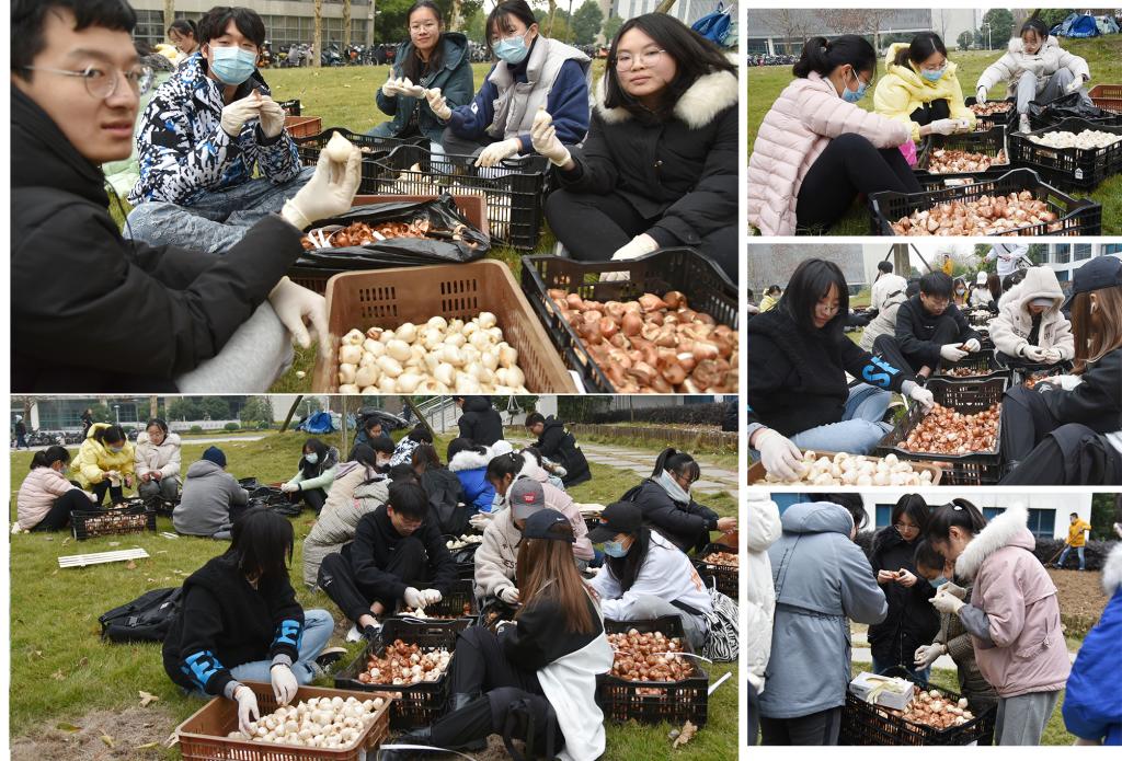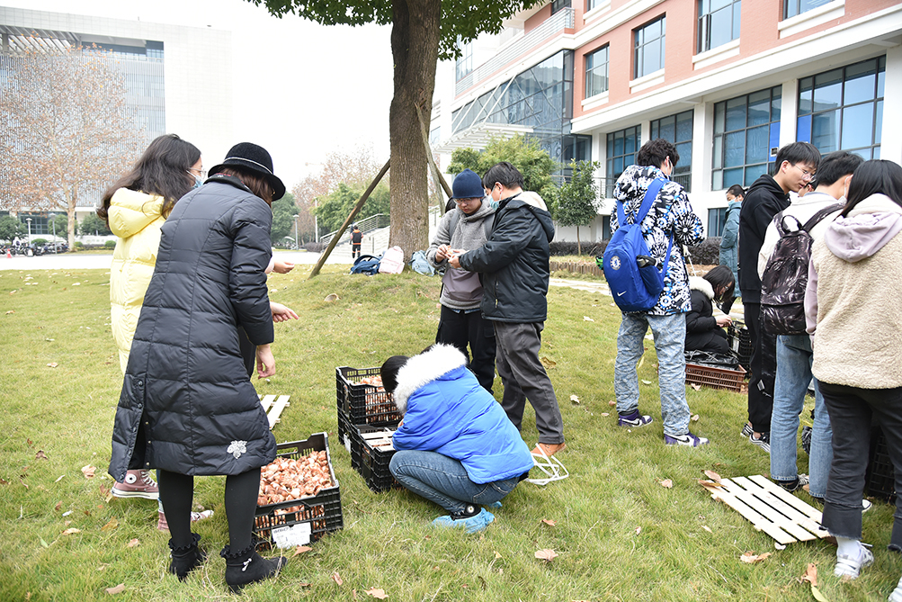 园林系产祝龙老师、何燕红老师指导学生们怎么处理郁金香种球