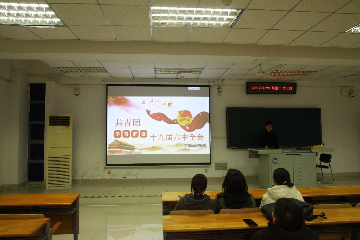 为深入贯彻学习党的十九届六中全会的重要精神,2021年11月23日晚, 21级蔬菜专硕班在三教A305教室召开学习党的十九届六中全会精神主题班会。