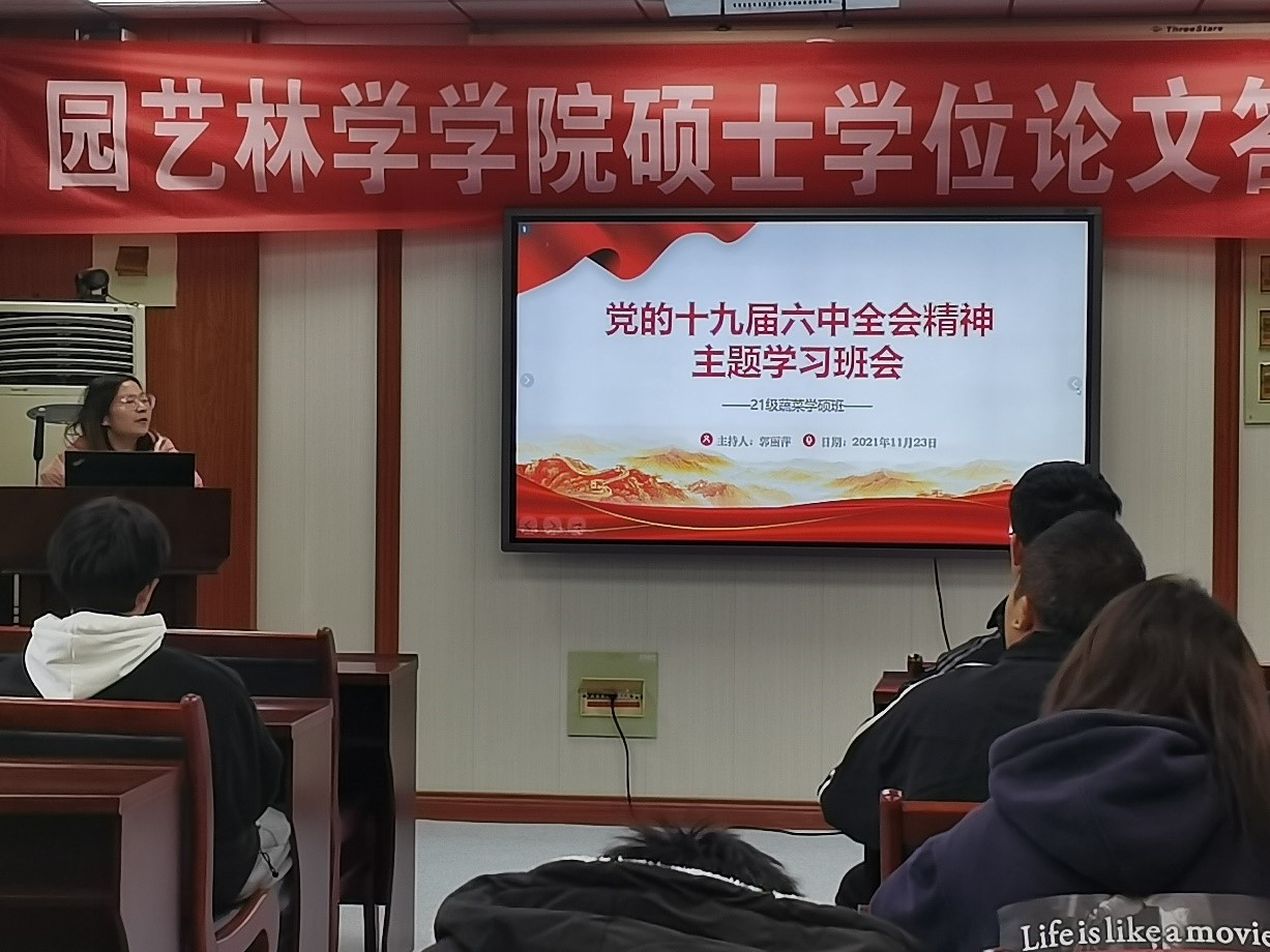 为深入贯彻学习党的十九届六中全会的重要精神,2021年11月23日,21级蔬菜学硕班在园林北楼615会议室召开学习党的十九届六中全会精神主题班会。