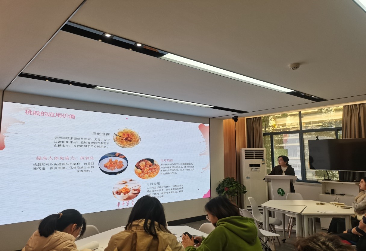 “桃之夭夭,灼灼其华”,潘佳佳用朗朗上口的诗词开头,为同学科普了桃树的常见病害,并着重讲解了桃流胶病的发病时间与症状。潘佳佳在科研过程中也遇到过很多难题,比如种子层积时间长,桃核出芽率低等问题,在失败的教训中,潘佳佳总结出:层级时水分要把控好,要做到无菌操作、多准备层积种子等。