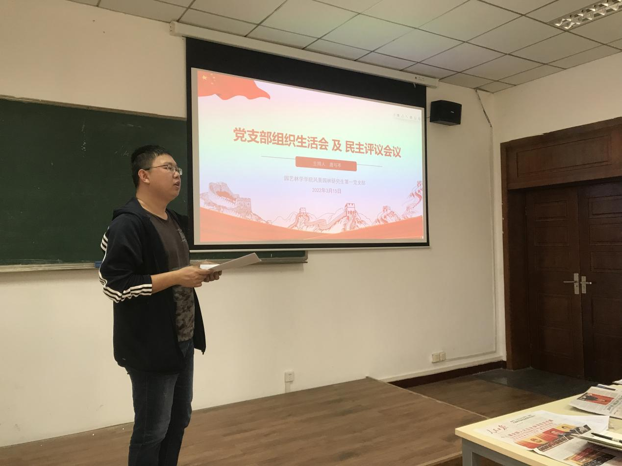 3月15日下午,风景园林系研究生第一党支部在景园楼309会议室召开2021年度党支部党建工作考核、党组织生活会及民主评议党员会议。本次会议内容包括党建工作总结思考、党员批评学习和民主评议三部分,党支部副支书唐与岑主持会议,党支部书记肖晗、党内其他成员参加会议。