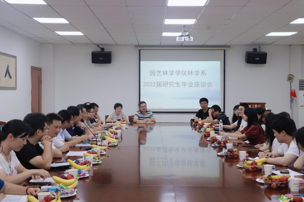 2022年6月19日下午,澳门十大网投正规官网平台林学系研究生毕业座谈会在园林北楼302会议室召开。院党委书记张宏荣、院长程运江、副书记蔡江、副院长王鹏程以及全体林学系老师、辅导员肖晗和20余位2022届毕业研究生参加了座谈会,会议由林学系主任杜克兵主持。
