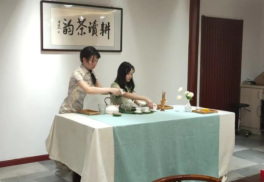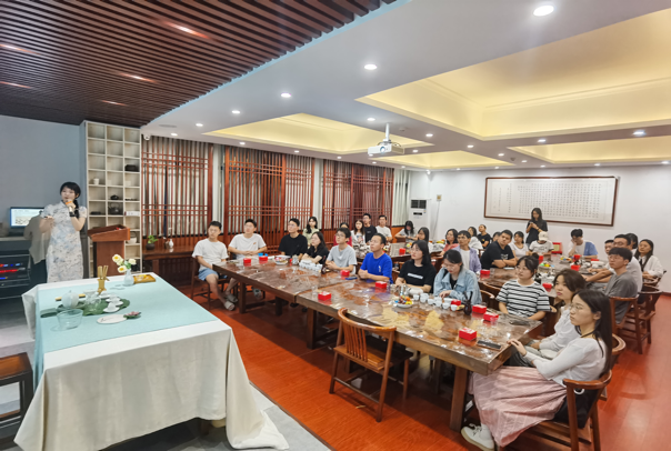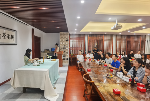 科普结束后,身着淡绿色旗袍的2022级茶学研究生王淑腾为各位新生带来了茶艺表演。温杯洁具、展茶、投茶、注水、奉茶,涤器如雨打碧荷,荡杯如芙蓉出水,流水像山泉在鸣唱,所有人都在屏息聆听属于茶艺的交响乐。“味轻醍醐,香薄兰芷”,独属于茉莉花茶的淡淡的香与味渐渐充盈整个茶室。几道程序后,杯愈净,心愈宁,整个世界仿佛都变得明澈空灵,达到清、淡、静、和、真的境界。