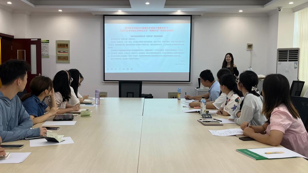 在第38个教师节到来之际,习近平总书记9月7日给北京师范大学“优师计划”师范生回信。信中鼓励广大青年要珍惜时光,毕业后到祖国和人民最需要的地方去,努力提升个人能力,以成为让人民满意的“四有”好老师为目标,不断奋进。澳门十大网投正规官网平台2022级研究生班级干部认真研读习近平总书记的寄语与嘱托,结合自身学习科研生活,分享讨论心得体会。