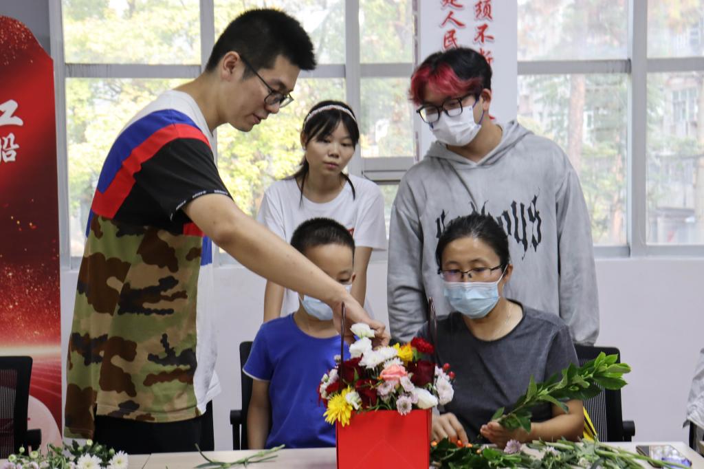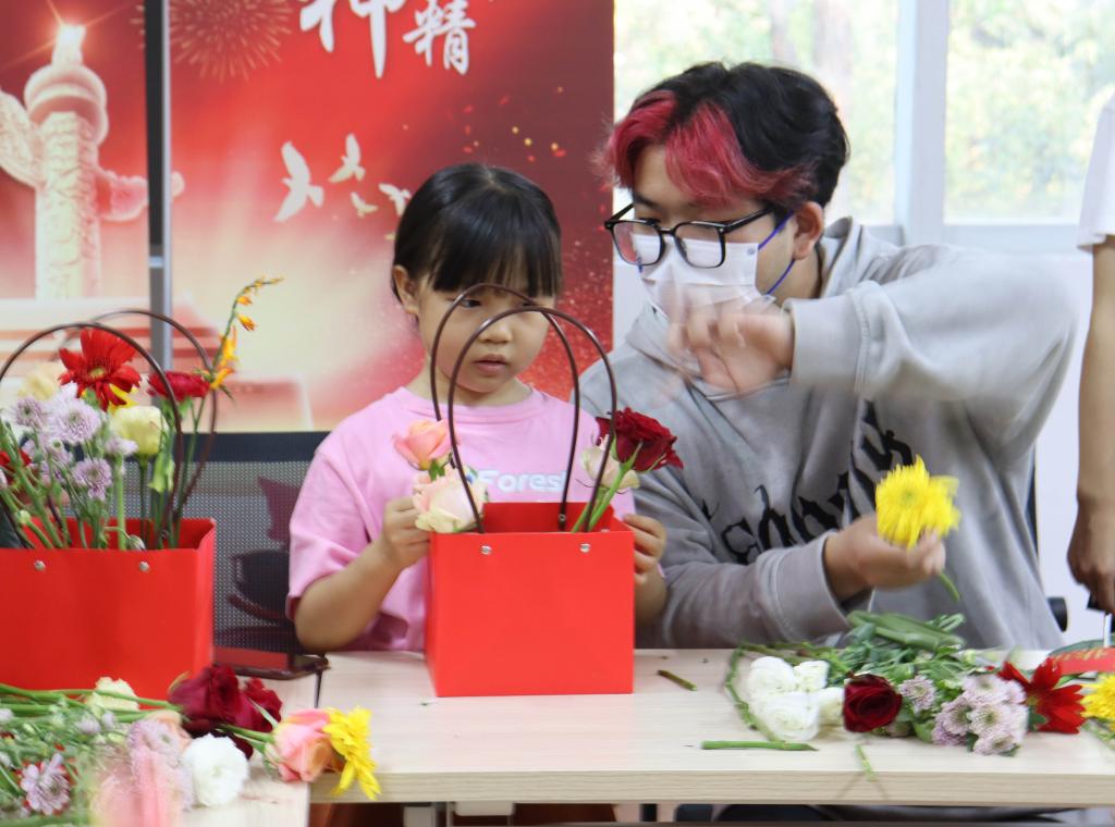 随后,小朋友们在志愿者的帮助下,开始自己的插花创作,从花枝的长短、花卉品种的挑选,再到摆放位置都展现出小朋友们独特的想法和天真的童趣。在红色的花盒中,一朵朵盛放的鲜花蕴含着小朋友们对祖国的爱,也寄寓着青春的祝福。