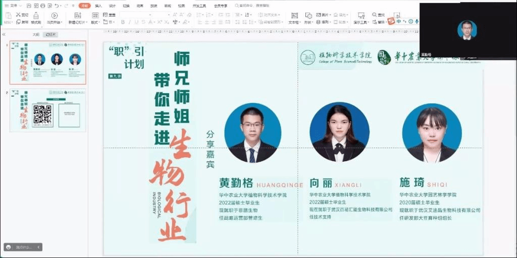 本次分享会邀请到了现就职于菲鹏生物股份有限公司运营岗的黄勤格师兄、就职于武汉百易汇能生物科技有限公司技术支持岗的向丽师姐以及就职于武汉艾迪晶生物科技有限公司研发岗的施琦师姐为同学们进行生物行业就职经验分享。