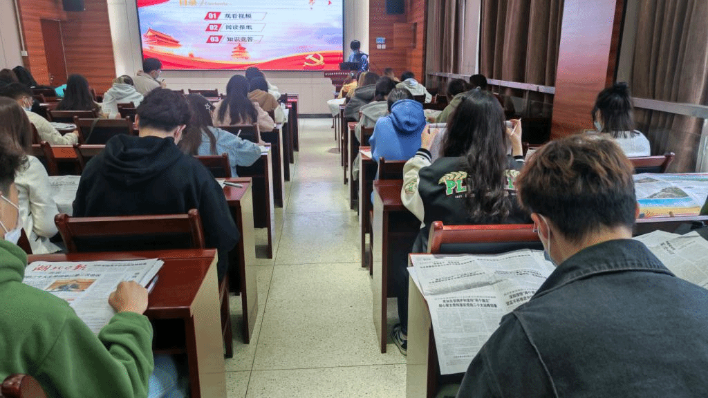 紧跟时事,提升政治素养。集体观看视频后,大家自由阅读了最新一期的人民日报、光明日报和湖北日报等,借助报纸关注身边大事,了解时事政治,学习党的二十大的相关内容,同时写下学习感悟,提高自身思想政治素养。