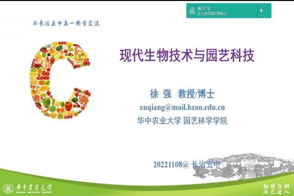 11月8日晚七点整,十大网投正规官网果树系教授徐强以“现代生物技术与园艺科技”为主题,通过腾讯会议向山西省长治市第五中学的高二年级学生开展科普讲座。