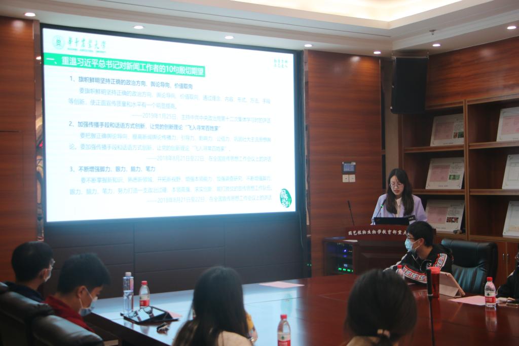 学校学通社记者、学院研究生会主席杨子萱对学院研究生新闻与宣传工作的寄语。杨子萱说到,记者节是中国仅有的六个行业性节日中的一个,作为农业院校的我们更应该以这种特殊的新闻工作者身份为荣。无论是国家大事还是家长里短的报道,只要用心对待这份工作,去感受园林研究生所需求的新闻内容,总会有人欣赏我们的文字与图片,总能有人因为我们的报道而受益而动容。在此之前,需要我们去学习工作的方法、去模仿优秀的作品、去提高记者必备的技能,争取创新和突破,成为一名优秀合格的新闻工作者。同时,她以个人学通社写稿经历分享了作为一名新闻工作者在现场需要做到的几点。不仅要看和听,更要动起来,去收集和整合场上信息,形成一篇完整的新闻呈现出来。最后,她希望在今后的工作中大家都能对新闻工作心存敬畏,在这份工作中得到快速的成长、得到内心的热爱、得到创意思维的新颖不断,一起在这份工作中与学院研究生们同呼吸,与澳门十大网投正规官网平台共进步,讲好园林故事,为卓越园林贡献自己的宣传力量。