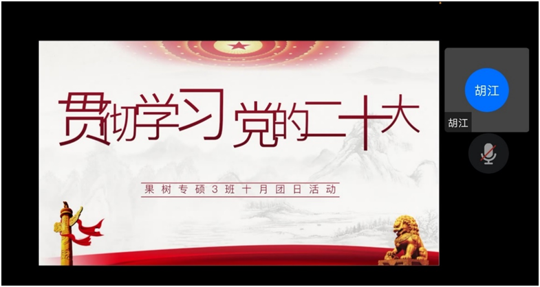 11月4日,22级果树专硕3班于线上开展了“贯彻学习党的二十大”十月团日活动。全体同学集中学习党的二十大精神,回顾经典名句,深刻领悟“六个必须坚持”、“中国共产党的中心任务”、“中国式现代化”、“两步走战略安排”等重要概念和战略安排。