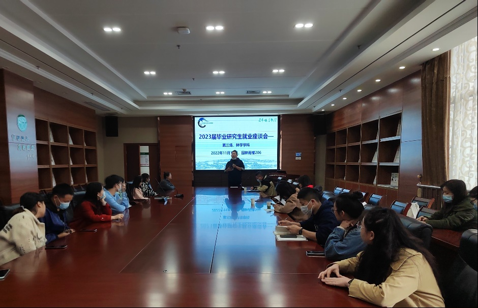 11月18日14时,园林院2023届毕业研究生就业座谈会第三场林学系专场在园林南楼206会议室举行,学院党委副书记蔡江、辅导员肖晗、林学系导师杜克兵、梅莉、丁寄花、王慧和2023届林学系研究生共同参会。
