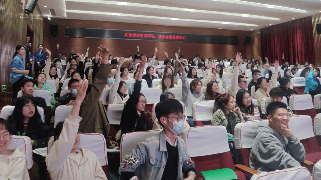 最后,活动以有奖竞答的方式收尾。一道道题目加深了大家对所学金融知识的理解与记忆。学院党委副书记蔡江在会议最后总结到,希望大家在面对诱惑时建立起明辨是非的能力,保护自己的人身与财产安全,时刻牢记安全第一,让健康 、快乐、安全伴随同学们成长。朱莉行长希望同学们珍惜校园生活,积极融入校园文化生活,走出宿舍、走下网络、走向操场,为建设平安校园、健康校园添砖加瓦。风景园林吴奇同学在活动后表示:“这次活动让我更加重视金融安全。之前如果熟人借用银行卡,可能会有一些犹豫,但听了讲座后我会果断拒绝该请求。”