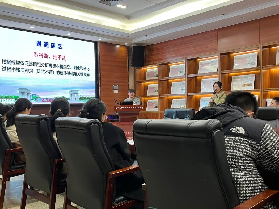 针对柑橘无核研究中的问题,李超超也解答了同学们的疑惑。针对同学们提出柑橘无核育种周期的问题,李超超表示:“将愈伤和叶片进行原生质体融合,半年后得到小苗,之后进行嫁接。大概3年可获得3个品种。”针对线粒体组装策略问题,李超超解释道:“利用全基因序列筛选出线粒体基因组,在柑橘中叶绿体基因是核基因的40倍以上,线粒体基因是核基因的10倍以上。锁定基因后利用PCR及测序进一步验证。”最后李超超鼓励大家多交流多尝试,不断给自己正向反馈,培养自己的科研兴趣。