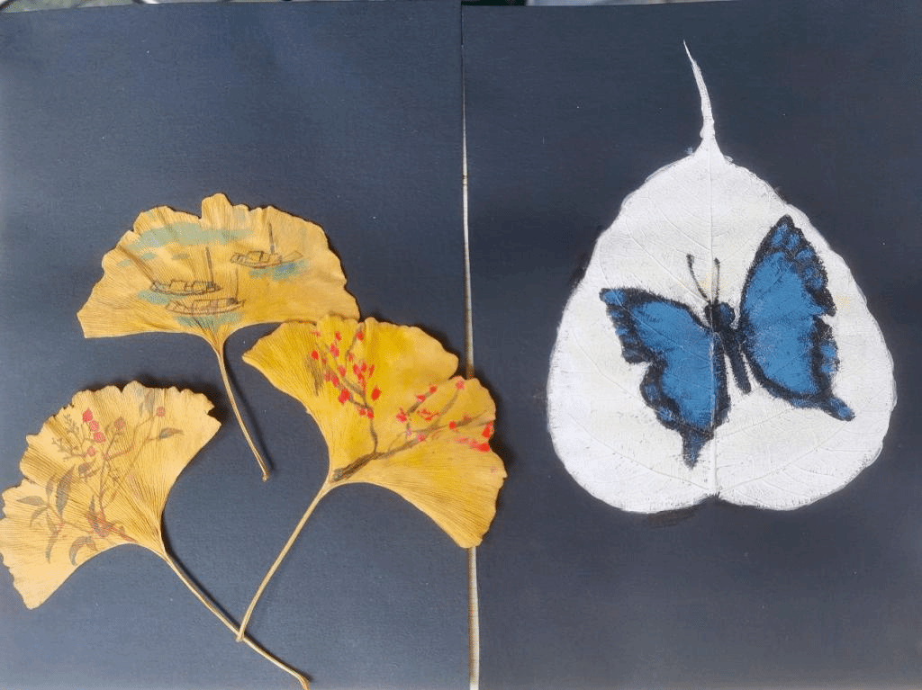党支部副书记王熙悦为前来学习体验的同学介绍讲解,叶画是武汉的一项非物质文化遗产,以叶子为绘画载体,借助叶子的形状、色彩、纹理、经脉、褶皱、破损依势作画,是一种将自然与艺术融为一体,生命与绘画相结合,令人与自然更贴切的绿色环保艺术。