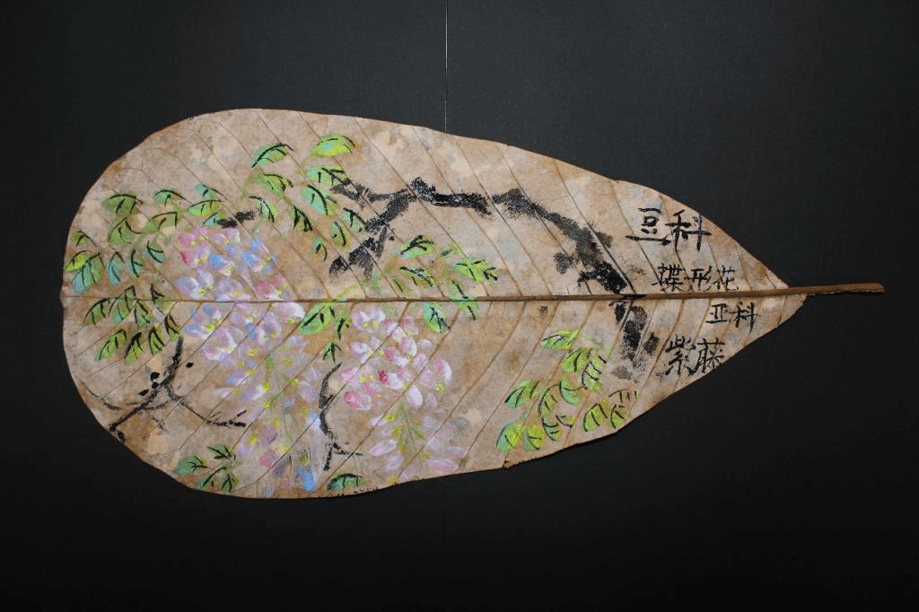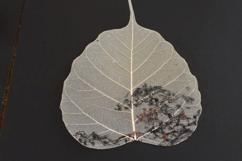 风景园林21级研究生张青青选择在菩提叶上作画,色彩在叶子上晕染开,形成一种朦胧的意境之美。而风景园林22级研究生胡雨琳则充分利用树叶的纹理和形态,在马褂木上简单的几笔勾勒,一件旗袍的形象就“跃然叶上”,活动组织者之一、风景园林研究生第一党支部党员孙长虹不禁感慨道:“去年秋天落下的一片树叶,今年春天以一种新的方式焕发生机。”