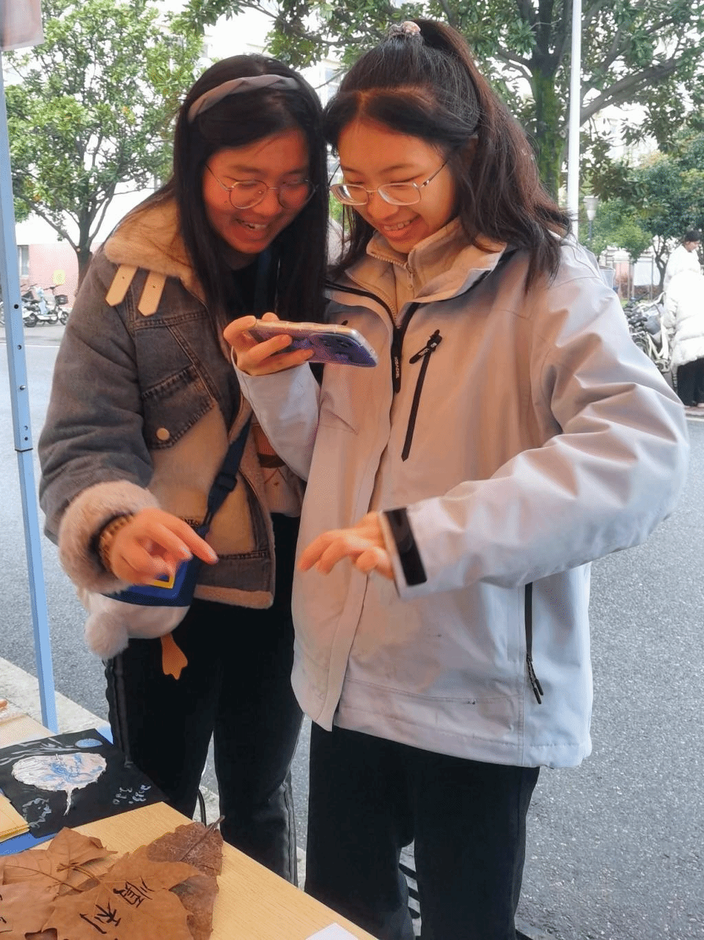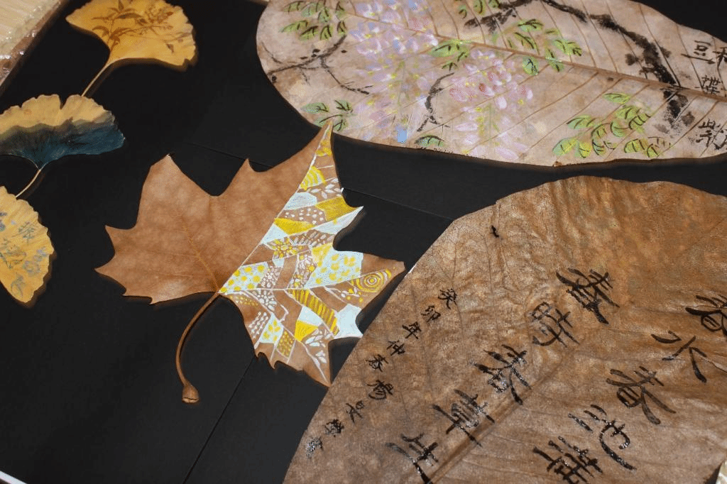 中南民族大学的一位大一的同学跟着华农的朋友一起来参与体验,她在悬铃木的叶子上写下“顺利”二字,希望自己和朋友都能学业顺利。信息学院人工智能专业的7名大一的同学也被吸引了过来,她们分别挑选了自己喜欢的树叶,有的在银杏叶上描绘红梅傲雪,有的在悬铃木叶上平涂渐变韵律,有的则在菩提叶上摹写山水意境,“世界上没有两片相同的树叶,每一片树叶都是有生命的,而有了绘画的树叶更是多了一份韵味”,其中一位同学说道。