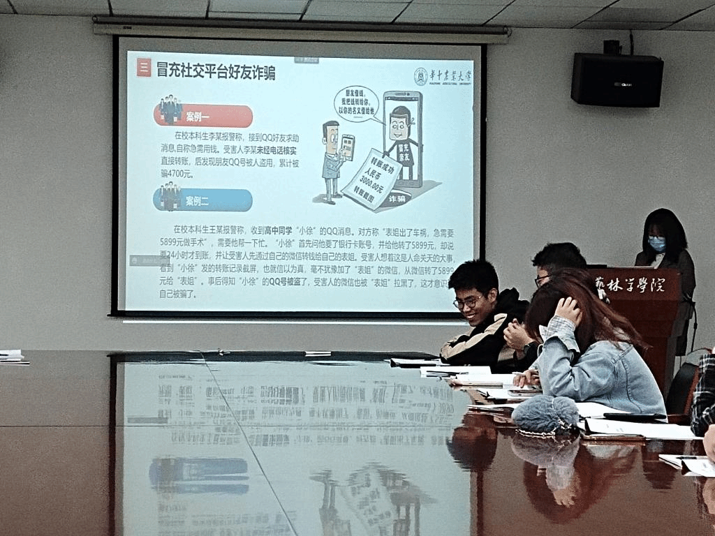 接下来,王瑜同学进一步向大家普及电信网络诈骗的防范知识,她强调,网络诈骗的方式多样,通过网络、电话、短信等传播媒介编造理由来骗取财物的行为越来越隐蔽,造成的伤害越来越大。这需要我们时刻保持警惕,摒弃“占小便宜”的坏想法。她向同学们强调在网络生活中应时刻保持警惕,理智对待不明信息。