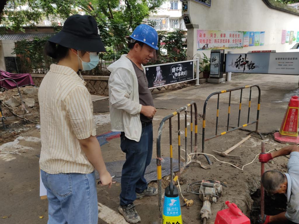 图为团队实践成员采访供水管道更新人员(通讯员 黄婧婷摄)