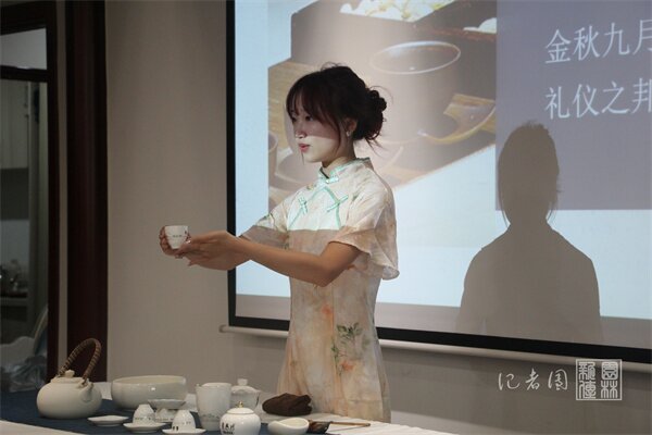 茶香悠悠四溢满屋,古筝缓缓似诉心声。茶学2301班主任助理冯钰雯带领茶学专业新生从茶的历史和种类、茶艺表演、品茶体验三个方面体验中国茶文化。优雅而富有韵致的茶艺表演如约而至。表演过程中将茶艺中的“春雨润洗,翻杯洁具、春风拂面,投杯入茶、浸润灵茶,幽香初现、春草回芳,凤凰点头、春意绵绵,佳茗酬宾、流连忘返,赏茶尝味、万古长春,收具谢礼”茶之七道融入民族服装、古典音乐等艺术形式,以向嘉宾奉茶完美收尾。同学们近距离感知了茶文化的魅力,体验了一场茶文化视觉和味觉的盛宴。