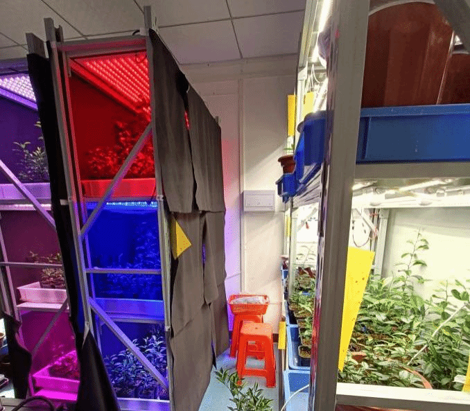 在参观植物生长室时,队员陈诗敏注意到里面有少部分的灯是彩色的,有红色、蓝色、紫色等,与日常我们见到的白光不一样,于是陈诗敏向师兄提出疑问,师兄回答说:“他们正在做一个光质影响植物生长的试验,植物生长在露天大自然中,已经形成了自己的光周期基因,植物灯可以将植物从室外带到室内,通过植物灯调节植物的光周期,从而影响植物的生长。植物灯主要是红光、蓝光、白光,之所以用这些光谱的灯,是因为无数的试验证明,植物生长最需要的光就是红光和蓝光,白光是为了补充植物生长可能需要的其他的光谱成分,全光谱植物灯发出的光谱主要也是红蓝光为主,光质对愈伤组织的引诱以及器官的分化也都有着显著的影响,进而影响植物的生长。”