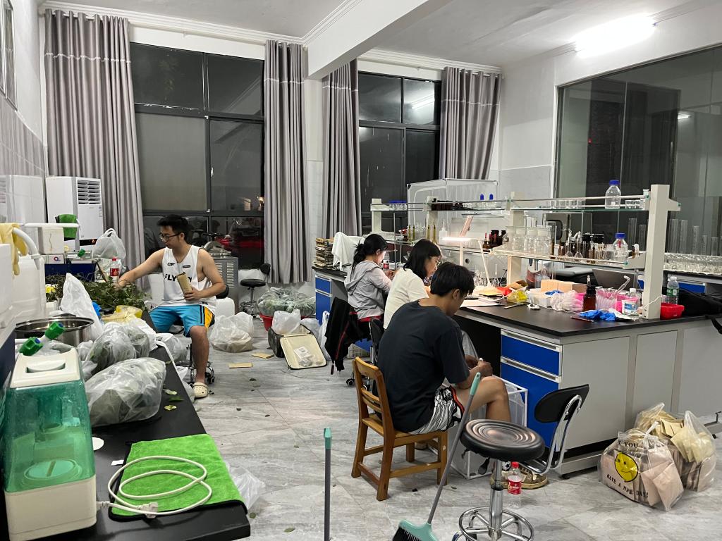 学生们晚上在林科院实验室里测量叶片性状