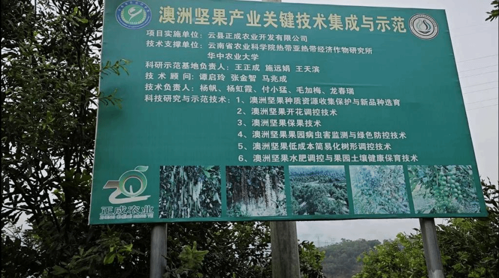 参观完澳洲坚果提质增效示范基地后,实践团来到了位于临沧市云县的澳洲坚果产业关键技术集成与示范基地。该基地的实施单位为云县正成农业开发有限公司,技术支撑单位为澳门十大网投正规官网平台和云南省农业科学院热带亚热带经济作物研究所。该基地主要的研究和示范技术为(1)澳洲坚果种质资源收集保护与新品种选育(2)澳洲坚果开花调控技术(3)澳洲坚果保果技术(4)澳洲坚果病虫害监测与绿色防控技术等。该基地的主要建圃品种为桂热一号、OC、A4、A16、农试344、农试296.