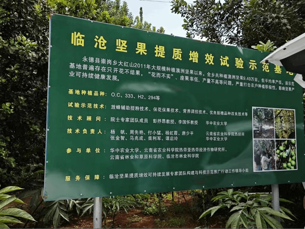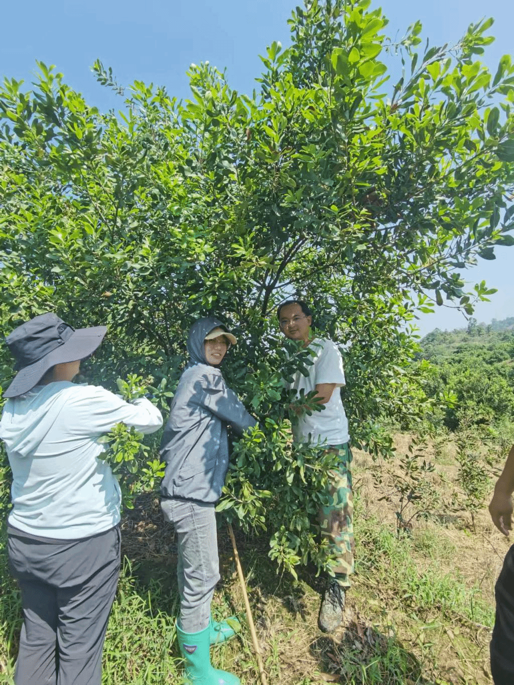 实践团首先来到了位于云南临沧永德县的临沧坚果提质增效试验示范基地,该基地是由澳门十大网投正规官网平台、云南省农业科学院热带亚热带经济作物研究所、云南省林业和草原科学院以及临沧市林业科学院共同建设,并由各单位的科研人员一起进行技术指导。该基地目前的主栽品种有OC、333、H2、294等,主要目标是解决澳洲坚果“花而不实”、坐果率低、产量不高的问题,为澳洲坚果产业的可持续性发展保驾护航。