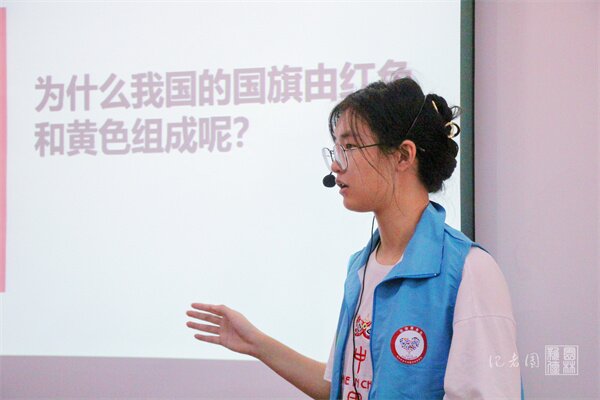 在园林北楼118活动室内,张瑜服务队的项之彦以“秋红鹅黄,秋韵国庆”为主题为小朋友们带来一个特殊的小课堂。“小朋友们,你们心中的秋天是什么颜色的呢?”“黄色的!”“彩色的!”“金灿灿的!”“红色的!”项之彦通过提问暖场,引导同学们主动回答。小朋友们的兴趣很快被激发,认真地听讲,纷纷举手回答问题。接着,她用小瓶子装豆子的例子,向同学们解释了秋天的银杏叶为什么会变黄以及成熟的苹果为什么会变红这两个自然现象。课堂最后,项之彦为小朋友们讲解了国旗的着色原因,希望小朋友能够不忘先烈前辈们的艰苦付出,传承他们的革命精神。