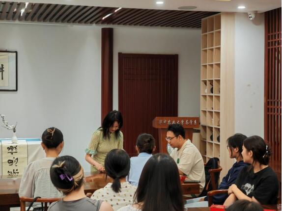 “茶滋于水,水藉乎器,汤成于火。四者相须,缺一则废。”由此可以看出茶器是冲泡一杯好茶不可或缺的条件之一。主持人一边介绍着茶器的基本知识,一边向同学们展示茶艺表演中使用到的茶器。精致的盖碗,小巧的品茗杯,木质的茶则,无不吸引着同学们的目光,激发大家对中国茶文化的好奇心。