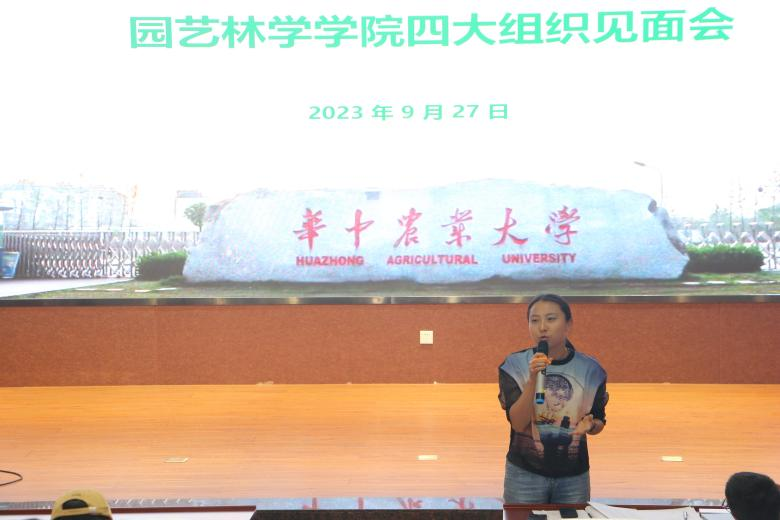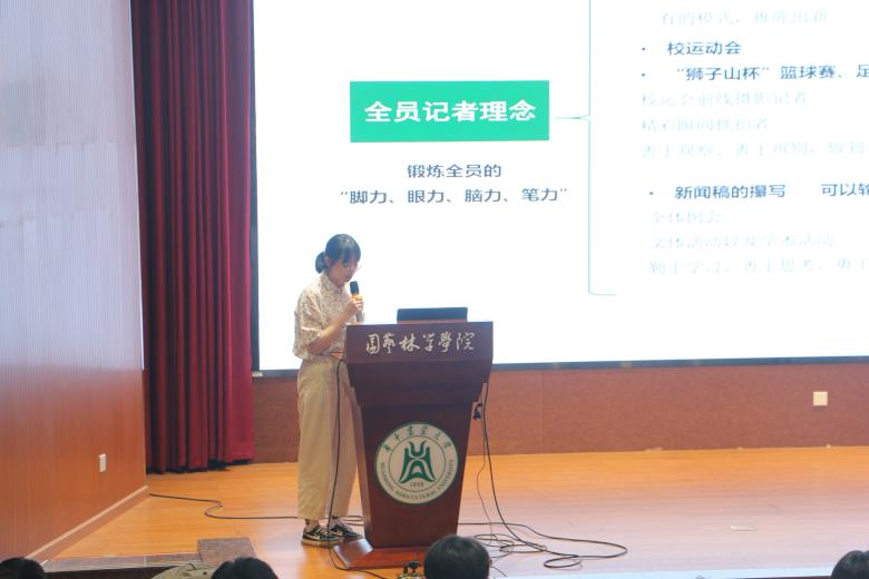 会议第四项,研究生会新闻与宣传部总负责人胡亚萍与大家一起探讨关于全员记者化的想法。首先,她围绕公众号、视频号、海报制作工作与部门建设四个方面对过去一年的工作进行简洁明了的总结,接着她提出:“全员记者化应当是让学生干部们都参与到其中,锻炼全员的脚力,眼力与笔力。”脚力为基础,呼吁大家真正讲好园林故事;眼力为关键,鼓励大家锻炼思维能力,要善于观察与判断;脑力笔力同样至关重要,激励大家每个人都要参与写稿,形成审稿小组互相促进。在场的各位学生干部纷纷对胡亚萍的发言鼓掌表示赞同。