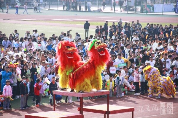 伴随阵阵鼓声,舞龙舞狮表演开始。 校党委书记高翅及400米栏记录保持者周忆美共同为醒狮点睛。“一点天庭,福星高照,国泰民安;二点眼睛,眼观六路,鹏程万里;三点口利,笑口常开,大吉大利。”锣鼓齐鸣,龙盘狮跃,精彩的舞龙舞狮表演引起了运动场一片沸腾。