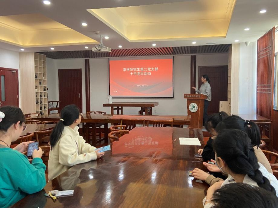 10月21日,茶学研究生第二党支部在园林北楼226耕读茶室开展十月主题党日活动,会议由党支部书记郭婧同志主持。