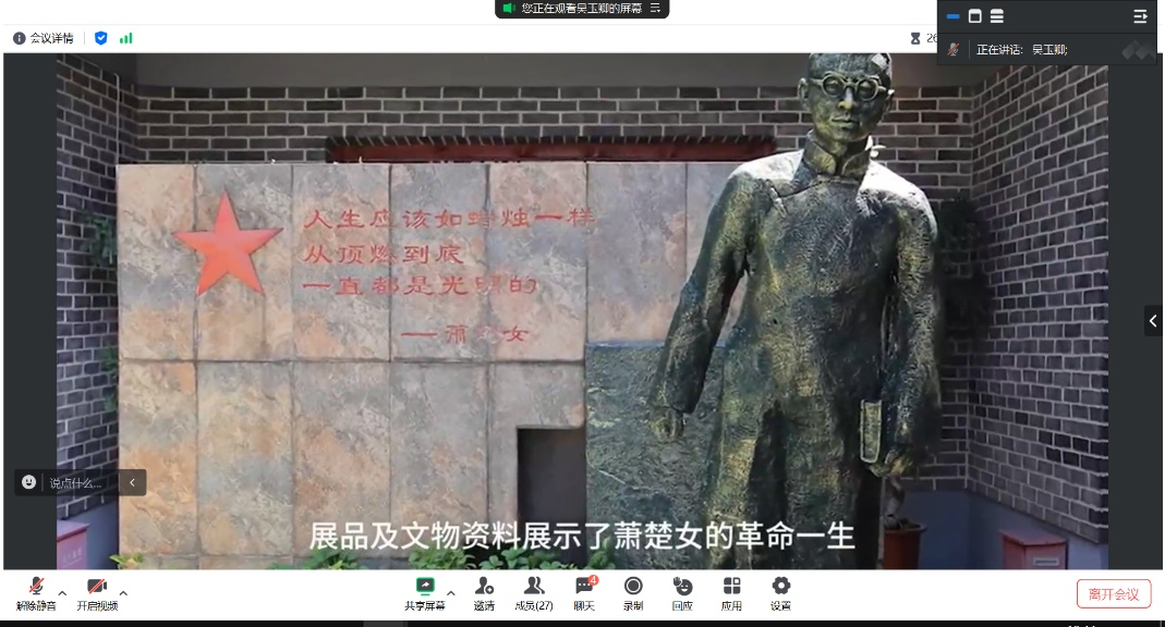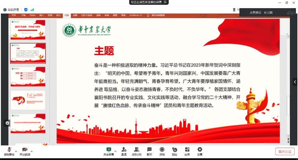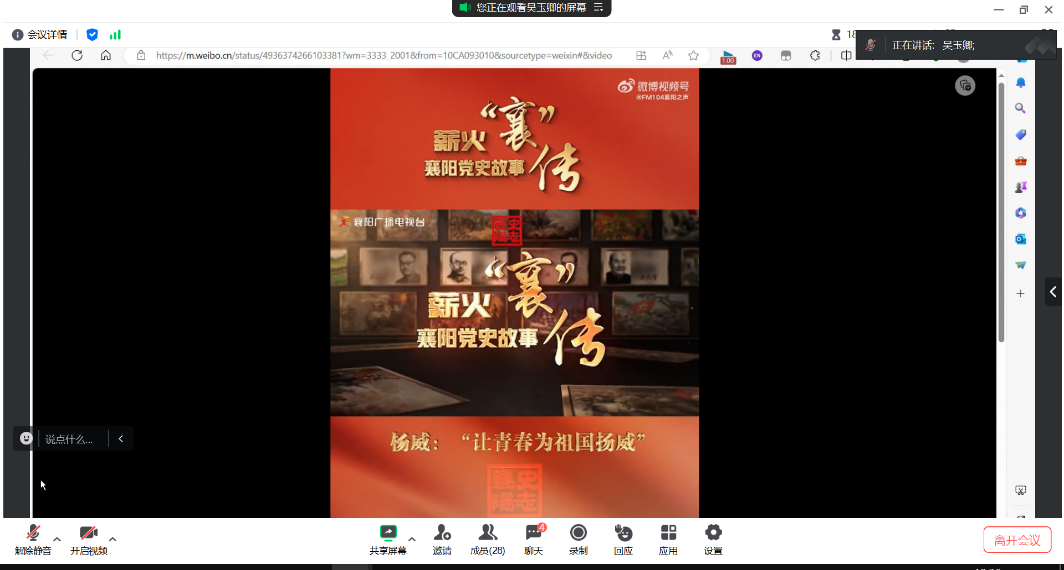 其次,团支书播放薪火“襄”传—襄阳党史故事中杨威的故事,切身感受杨威革命期间视死如归,敢于以青春奋斗的伟大精神。并播放华农学子重走襄阳红色路,历史文化伴我行的视频,加深了同学们对襄阳红色文化和历史文化的理解。