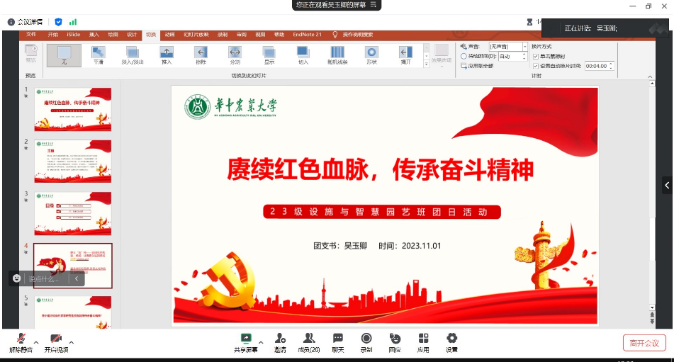 澳门十大网投正规官网平台2023级设施与智慧园艺班 “赓续红色血脉,传承奋斗精神” 研究生团员和青年主题教育活动于11月01日12:30在腾讯会议顺利召开,见面会由团支书吴玉卿主持。