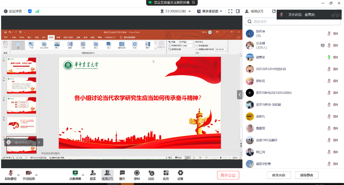 以上两个视频引发同学们的激烈讨论,并针对“当代农学研究生应当如何传承奋斗精神”这一问题发表小组感悟。