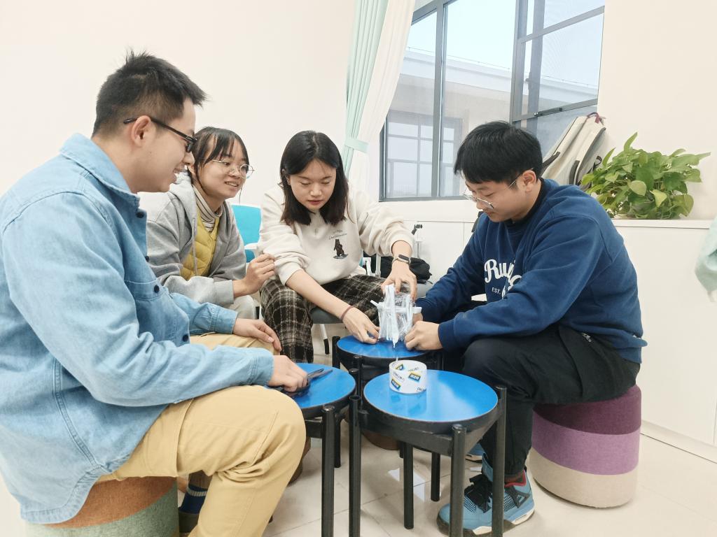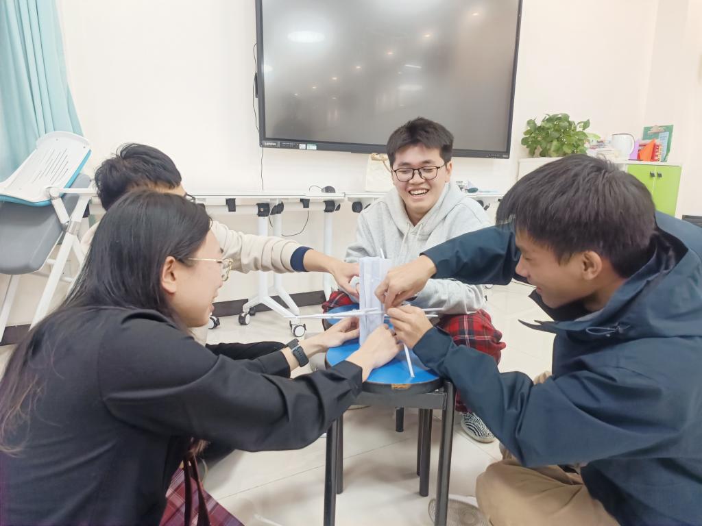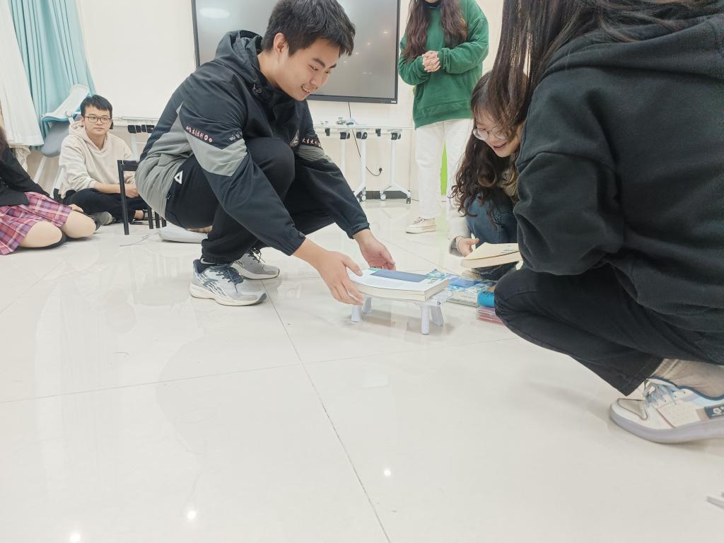 在同学们彼此了解之后,主持人使用报数的形式,将大家恰好分成四个组,开始了下一个环节“重物塔”。“重物塔”需要由小组成员积极合作,用10张以内A4纸和胶带制作成足够抗压的结构。在此过程中,同学们需要积极沟通,团结协作。每个小组的最终成果都令人满意。郑奕扬表示,这个游戏正是团队协作的具体体现,虽然每个组的成品都不一样,但大家都得到了最满意的结果。