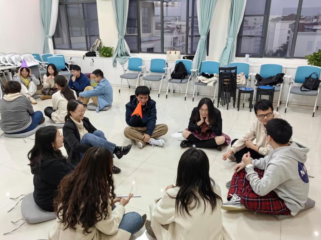 接下来进行的是“戴高帽”环节,在此环节中所有同学被分成两组,每一组的每一个人都将戴上“高帽”,接受所有组员对自己的夸奖。在过程中,有同学显得落落大方,有同学脸颊通红,有同学用最直白的话语打动人心,有同学则“花式”夸夸对方。董依萍表示,自己在被大家夸奖的时候很开心,大家的形容词都用得很贴切,甚至有些被夸奖的地方是曾经自己还没有注意的地方。郑奕扬表示,我们每个人都有自己的闪光点,每个人都是闪闪发光的美好,我们也应当善于发现自己的闪光点。